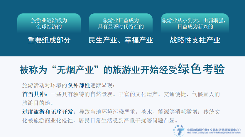 20世纪中叶起,全球经济逐渐复苏并快速增长,工业化和城市化逐步加快,交通、通讯、支付等基础设施和旅游设施的改进,大众消费文化的兴起,为旅游给予了更多便利,旅游业全球化加速开展,并逐渐成为全球经济的重要组成部分。改革开放特别是党的十八大以来,我国旅游开展步入快车道,旅游业从小到大、由弱渐强,日益成为新兴的战略性支柱产业和具有显著时代特征的民生产业、幸福产业。旅游业通常被认为是“无烟工业”“无形贸易”。然而,由于旅游产业价值链条构成的碎片化,过度旅游和无序开发留下深深的环境足迹,比如环境污染严重,能源消耗激增,传统文化被旅游商业化侵蚀,居民日常生活受到干扰等问题。