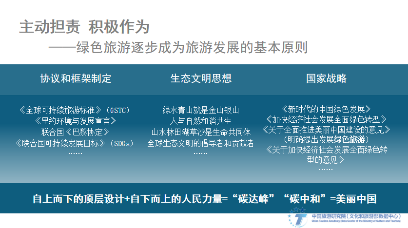 我们更加关注环境,主动担责,持续作为《全球可持续旅游标准》《里约环境与开展宣言》、联合国《巴黎协定》《联合国可持续开展目标》等国际标准和公约相继出台,习近平生态文明思想、绿色开展理念的重要论断,为新时代中国绿色旅游开展给予了理论遵循和思想指引。