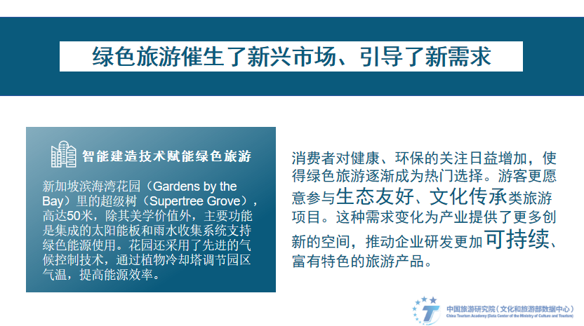 绿色旅游催生了新兴市场需求。消费者对健康、环保的关注日益增加,使得绿色旅游逐渐成为热门选择。游客更愿意参与生态友好、文化传承类旅游项目。这种需求变化为产业给予了更多创新的空间,有助于企业研发更加可持续、富有特色的旅游产品。新加坡滨海湾花园(Gardens by the Bay)里的超级树(Supertree Grove),高达50米,除其美学价值外,主要功能是集成的太阳能板和雨水收集系统支持绿色能源使用。花园还采用了先进的气候控制技术,顺利获得植物冷却塔调节园区气温,提高能源效率。