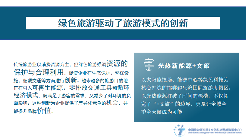 总结以上绿色旅游的产业实践,我们发现:绿色旅游驱动了旅游模式的创新。传统旅游业以消费资源为主,但绿色旅游强调资源的保护与合理利用,促使企业在生态保护、环保设施、低碳交通等方面进行创新。越来越多的旅游目的地正在引入可再生能源、零排放交通工具和循环经济模式,既满足了游客的需求,又减少了对环境的负面影响。这种创新为企业给予了差异化竞争的机会,并能提升品牌价值。以太阳能镜场、能源中心等绿色科技为核心打造的邯郸鲲乐湾国际旅游度假区,以光热能源打破了时间的桎梏,不仅拓宽了“+文旅”的边界,更是让全域全季全天候成为可能。