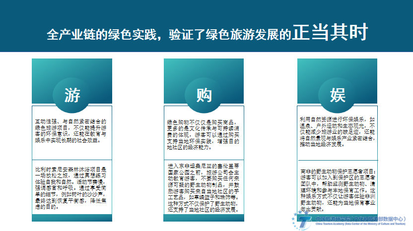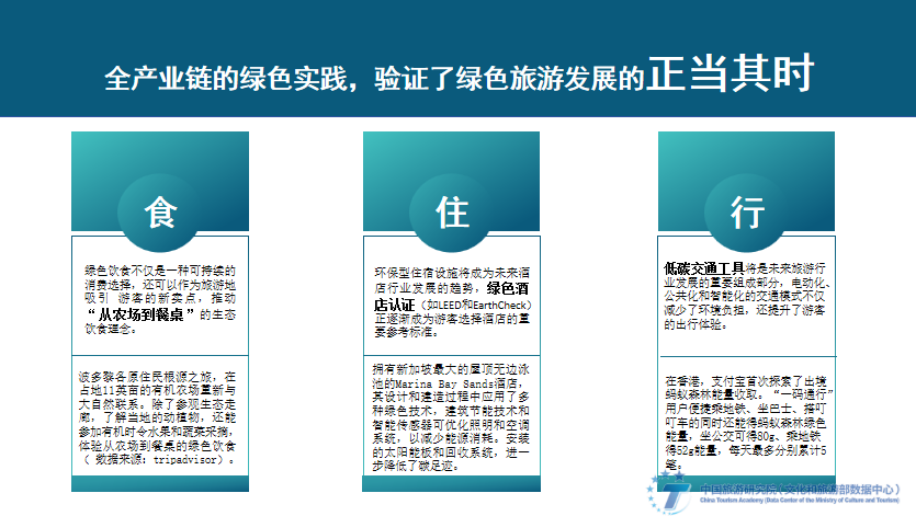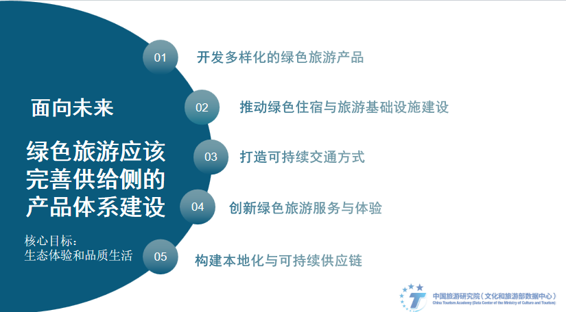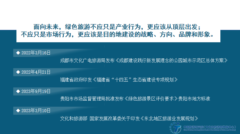 面向未来,绿色旅游不应只是产业行为,更应该从顶层出发;不应只是市场行为,更应该是目的地建设的战略、方向、品牌和形象。《成都建设践行新开展理念的公园城市示范区总体方案》《绿色旅游景区评价要求》贵阳市地方标准、《东北地区旅游业开展规划》相继推出,都是以绿色旅游开展理念为引领,探索旅游业开展新模式,实践生态保护、绿色开展和旅游开展相统一的举措。