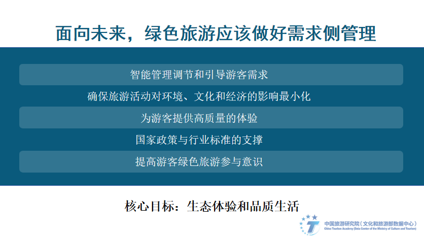 开展绿色旅游的核心目标是生态体验和品质生活。面向未来,绿色旅游第一时间应该实行需求侧管理。目的地也在围绕智能管理调节、降低对环境、文化和经济的影响、给予高质量体验、出台政策与标准、增强公众绿色环保意识等方面持续实践。比如:随季节不同,全国多个旅游目的地执行淡旺季票价,如山西省诸多景区、贵州诸多景区、扬州部分景区、更有故宫、布达拉宫、青海湖、黄山、莫高窟、九寨沟等多家知名5A级景区均位列其中。比如广东从2010年4月起,省星级饭店已实行不再一次性日用品配送至每间客房,仅在客人有需要时配送。倡导游客入住尽可能自己携带相关日用品,促进资源的减量化和再利用。浙江西塘率先在省内制定《低碳旅游细胞标准》,结合旅游产业特色,打造民宿餐饮低碳品牌,引导民宿、餐饮形成绿色经营方式、给予绿色服务产品、营造绿色消费环境。