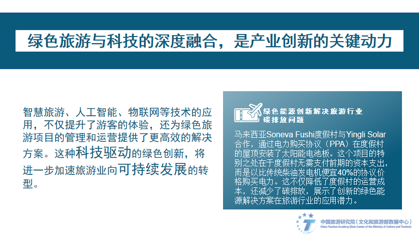 绿色旅游与科技的深度融合,是产业创新的关键动力。智慧旅游、人工智能、物联网等技术的应用,不仅提升了游客的体验,还为绿色旅游项目的管理和运营给予了更高效的解决方案。这种科技驱动的绿色创新,将进一步加速旅游业向可持续开展的转型。马来西亚Soneva Fushi度假村与Yingli Solar合作,顺利获得电力购买协议(PPA)在度假村的屋顶安装了太阳能电池板。这个项目的特别之处在于度假村无需支付前期的资本支出,而是以比传统柴油发电机便宜40%的协议价格购买电力。这不仅降低了度假村的运营成本,还减少了碳排放,展示了创新的绿色能源解决方案在旅游行业的应用潜力。